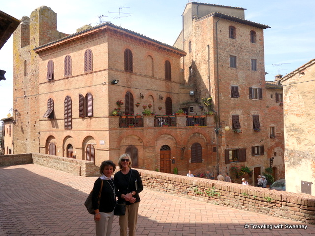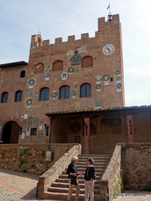 Standing on the terrace of the palazzo, Egle and I enjoyed a nice view of neighboring buildings with Certaldo’s signature red bricks and adorned with flower pots and classic Tuscan shutters.