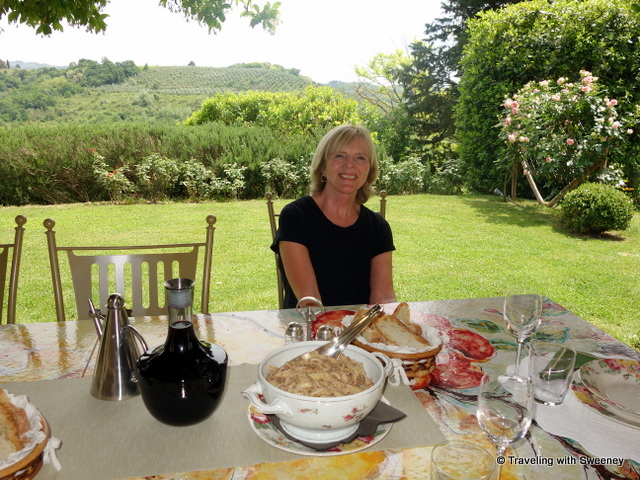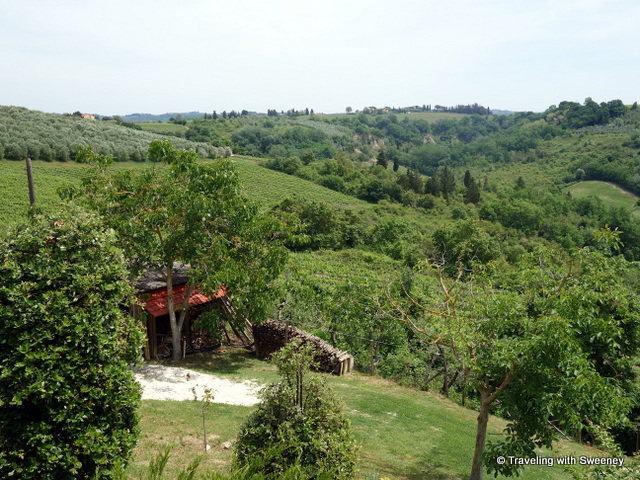 Bicycles for exploring the area are stored in the “Green House”, the small shed beyond the well that Egle was showing me in the photo above. Besides biking, there are a number of recreational and cultural activities such as winery visits, cooking classes, hot-air ballooning, golfing, excursions to Florence (20 miles) and Siena (30 miles), and visits to Certaldo, San Gimigano and other Tuscan towns. Egle and Claudia are clearly committed to providing their villa guests with customized experiences from peaceful retreats to active vacations. Among many other reasons I’d like to come back to Tuscany would be to go cycling through villages and countryside. I should have made a wish for that at the wishing well before we left.