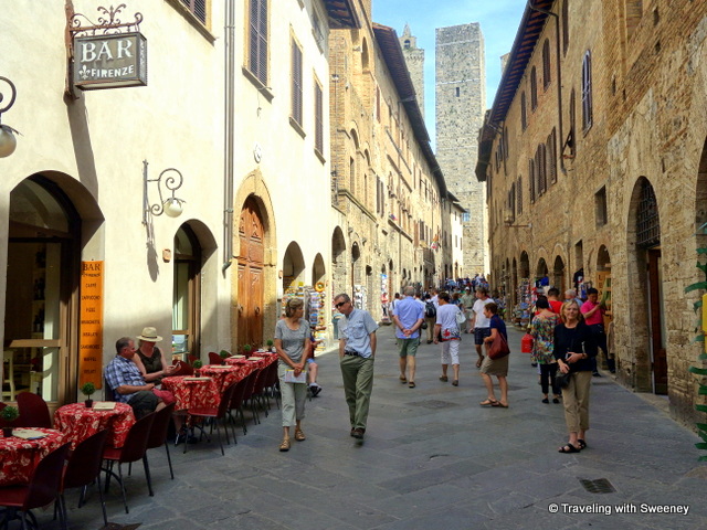 Egle enthusiastically recommended that we see the historic center of San Gimignano, a key stop on the Via Francigena (the ancient road and pilgrimage route to and from Rome), even for just a short while to walk in the footsteps of history. It’s a very popular town for visitors who marvel at its famous towers, remnants of medieval times. As we made our way to the highest point of the town, along every street and in every piazza of this UNESCO World Heritage Site, there were enticing scenes and a bustle of activity.