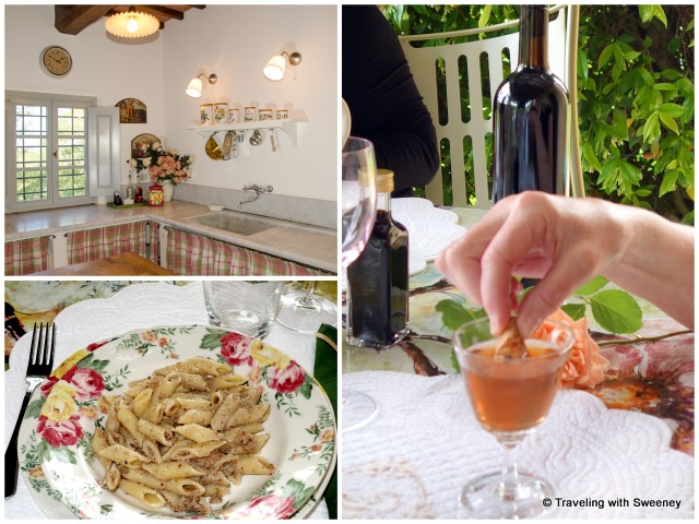 Bright and airy kitchen; lunch of pasta with walnut sauce followed by biscotti and Vin Santo